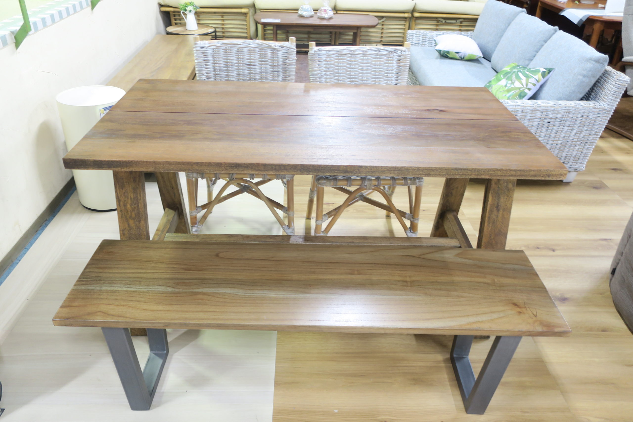 南国のマンゴー材の無垢板を使用し、重厚感のあるブラウンアンティークカラーに仕上げたダイニングテーブル\(^o^)/