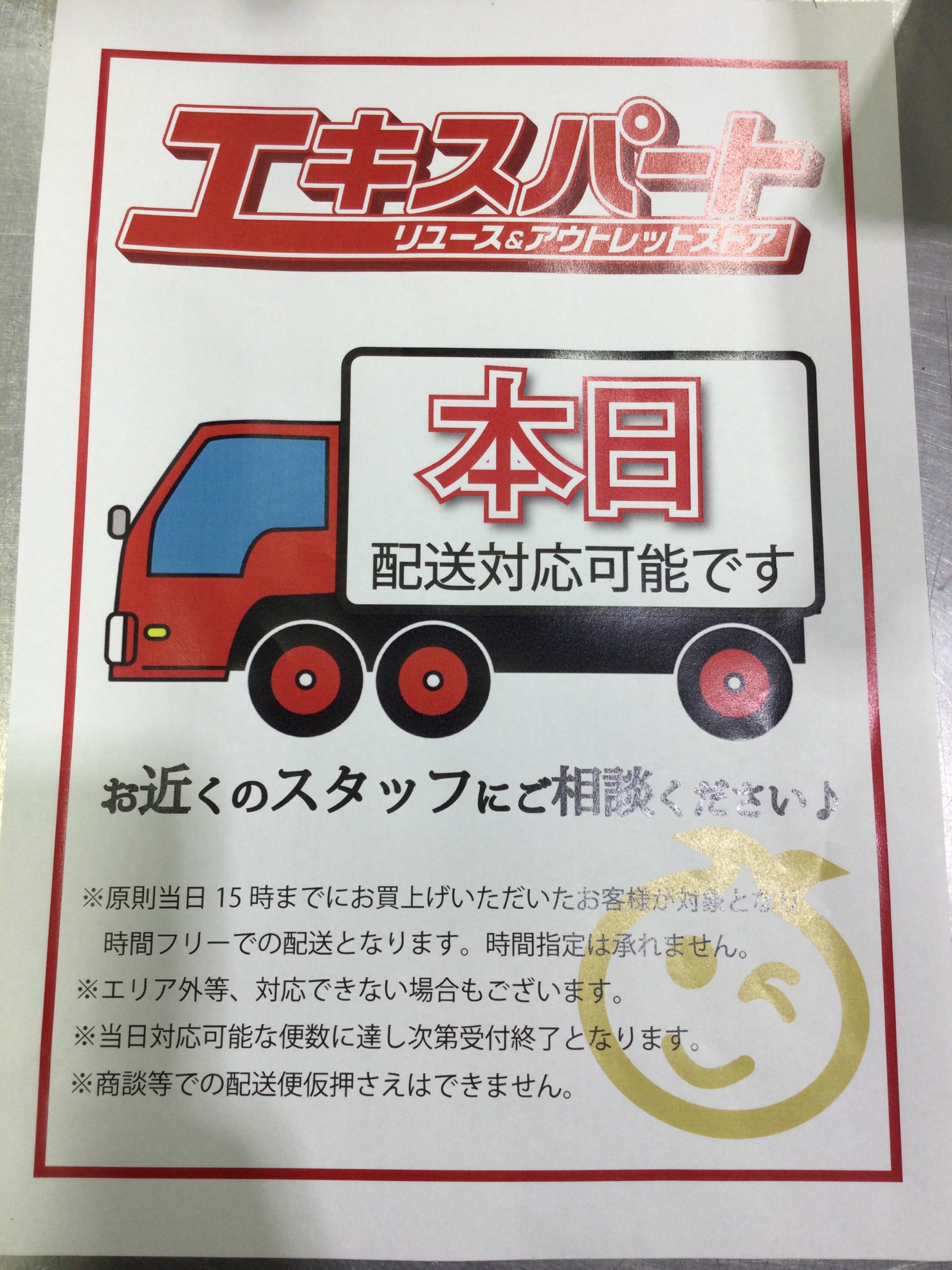 当日、飛込みでの配送も承ります!! ※条件アリ 詳しくはスタッフまで。